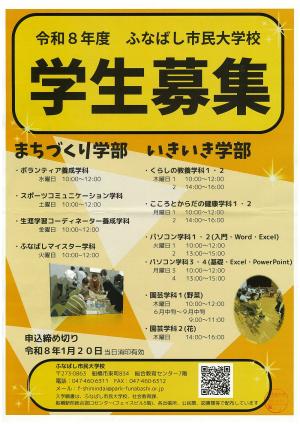 船橋市からのお知らせ公開日:2025年12月01日【ふなばし市民大学校】令和8年度 学生募集についてふなばし市民大学校では、令和8年度の学生を募集いたします。