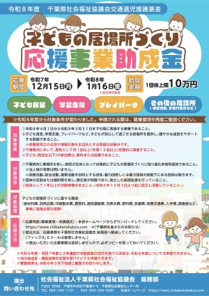 船橋市からのお知らせ公開日:2025年11月27日【千葉県社会福祉協議会】令和8年度「子どもの居場所づくり応援事業助成金」助成団体の募集について子どもの貧困は、経済的な困窮にとどまらず、学習面や生活面、心理面など様々な面において、子どものその後...