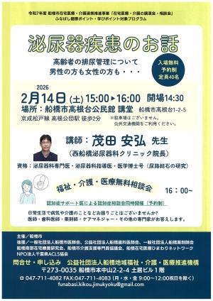 船橋市からのお知らせ公開日:2026年01月23日【船橋市】令和7年度船橋市在宅医療・介護連携推進事業「泌尿器疾患のお話」のお知らせ日時:令和8年2月14日(土) 1145:00~16:00(開場14:30~)