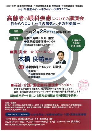 船橋市からのお知らせ公開日:2026年02月04日【船橋市】令和7年度船橋市在宅医療・介護連携推進事業「高齢者の眼科疾患についての講演会」のお知らせ日時:令和8年2月28日(土) 開場13:30~