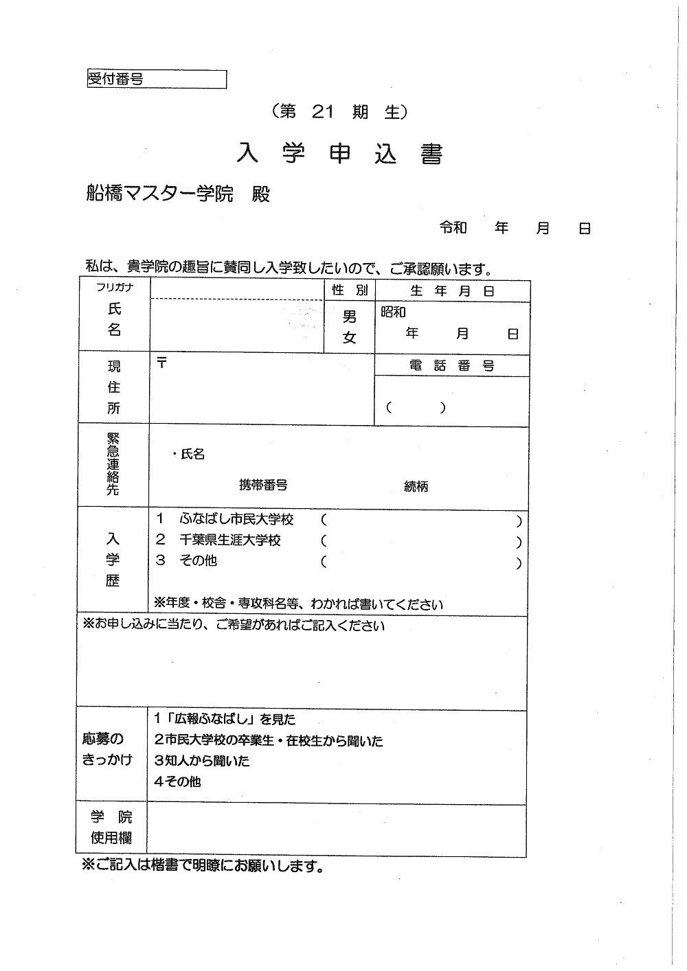 | 問い合わせ先 | 船橋マスター学院事務局 伊藤 民夫 宛 〒273-0042 船橋市前貝塚町747-4 TEL.090-8945-7625 |