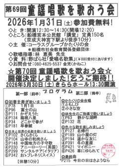 公開日:2025年12月15日社会教育・生涯学習の推進コーラスグループ かたくりの会【S0408】第69回 かたくりの会主催 童謡唱歌を歌おう会開催日:2026年01月31日(土)