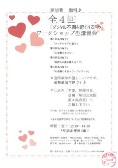 公開日:2026年03月27日その他共助サークル「フルネスセラピー」【S0035】「メンタル不調を軽くするコツ」ワークショップ型講習会開催日:2026年04月26日(日)、05月10日(日)、05月31日(日)、06月14日(日)