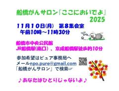 公開日:2025年11月04日保健、医療、介護、福祉の増進(特)千葉・在宅ケア市民ネットワーク ピュア【S0186】船橋がんサロン「ここにおいでよ」2025年11月10日開催日:2025年11月10日(月)