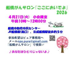 公開日:2026年04月06日保健、医療、介護、福祉の増進(特)千葉・在宅ケア市民ネットワーク ピュア【S0186】船橋がんサロン「ここにおいでよ」2026年4月21日開催日:2026年04月21日(火)