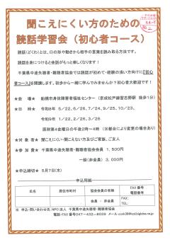 公開日:2026年04月13日保健、医療、介護、福祉の増進特定非営利活動法人 千葉県中途失聴者・難聴者協会【S0231】聞こえにくい人のための読話学習会(初心者コース)開催日:毎月第4金曜日