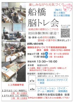 公開日:2025年10月27日保健、医療、介護、福祉の増進健康生きがいづくり千葉県連絡協議会【S0355】船橋脳トレ会開催日:2025年11月04日(火)、18日(火)