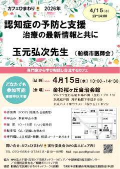 公開日:2026年04月06日保健、医療、介護、福祉の増進(特)千葉・在宅ケア市民ネットワーク ピュア【S0186】カフェひまわり🌻2026年4月15日「認知症の予防と支援 治療の最新情報と共に」開催日:2026年04月15日(水)