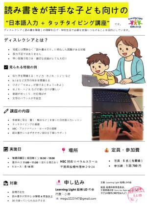 開催日:毎週月曜日開催時間:・毎週月曜日(祝日除く)18:30~19:00 ・夏休みは11:00~11:30に変わる場合あり ・1コース:全18回読み書きが苦手な子ども向けの ” 日本語入力+タッチタイピング講座 ” です。 ディスレクシア(読み...