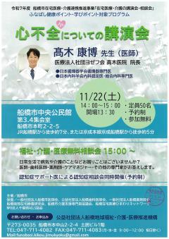公開日:2025年11月10日船橋市からのお知らせ船橋市役所 市民協働課【船橋市】令和7年度船橋市在宅医療・介護連携推進事業「心不全についての講演会」お知らせ日時:令和7年11月27日(土) 14:00~15:00(開場13:30~)