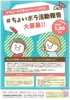 公開日:2025年11月14日船橋市からのお知らせ船橋市役所 市民協働課【千葉県】#ちょいボラキャンペーン2025の募集について千葉県では、身近なことでできる″ちょっとした“ボランティア活動#ちょいボラを広めるキャンペーンとして...