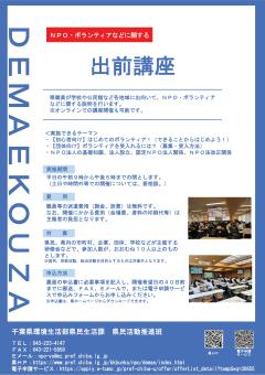 公開日:2025年11月19日船橋市からのお知らせ船橋市役所 市民協働課【千葉県】NPO・ボランティアなどに関する出前講座の実施について県民の皆さんからの要請に応じて職員が出向き、NPO・ボランティアについての解説や意見交換を行います。...