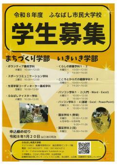 公開日:2025年12月01日船橋市からのお知らせ船橋市役所 市民協働課【ふなばし市民大学校】令和8年度 学生募集についてふなばし市民大学校では、令和8年度の学生を募集いたします。
