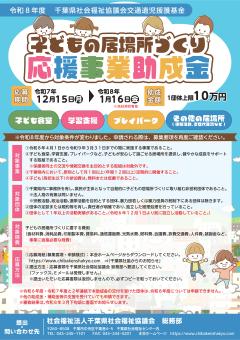 公開日:2025年11月27日船橋市からのお知らせ船橋市役所 市民協働課【千葉県社会福祉協議会】令和8年度「子どもの居場所づくり応援事業助成金」助成団体の募集について子どもの貧困は、経済的な困窮にとどまらず、学習面や生活面、心理面など様々な面において、子どものその後...